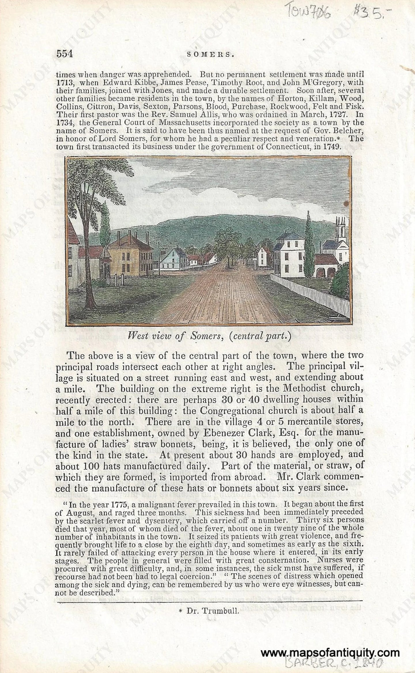 Antique illustration showing a view of Somers, Connecticut, by Barber. Page of text surrounding the image. Recent Hand Coloring. Very good overall antique condition with areas of very minor toning/foxing, as well as some mild wrinkling of the paper. Page measures approximately 9" x 5.5" (H x W) overall.