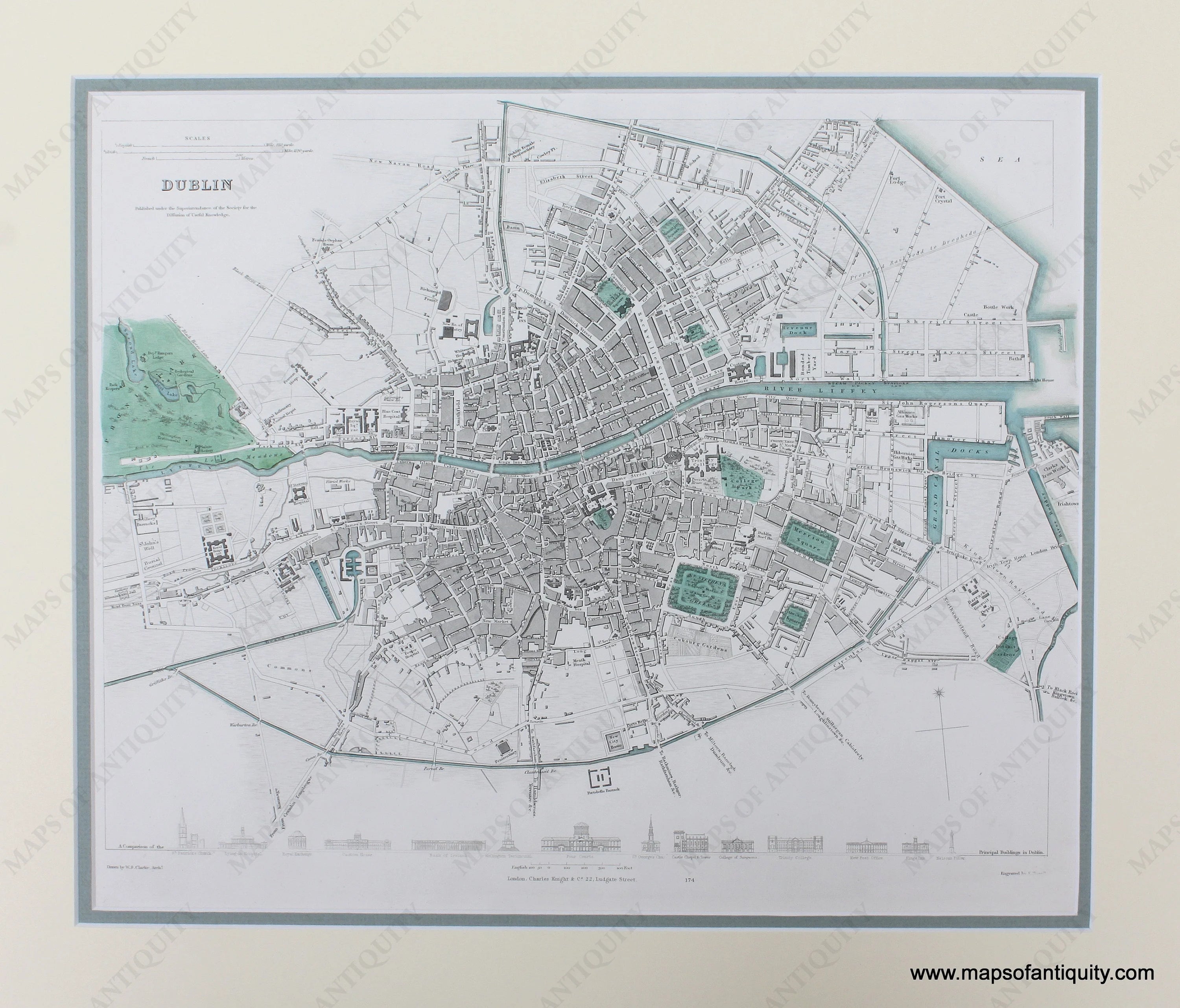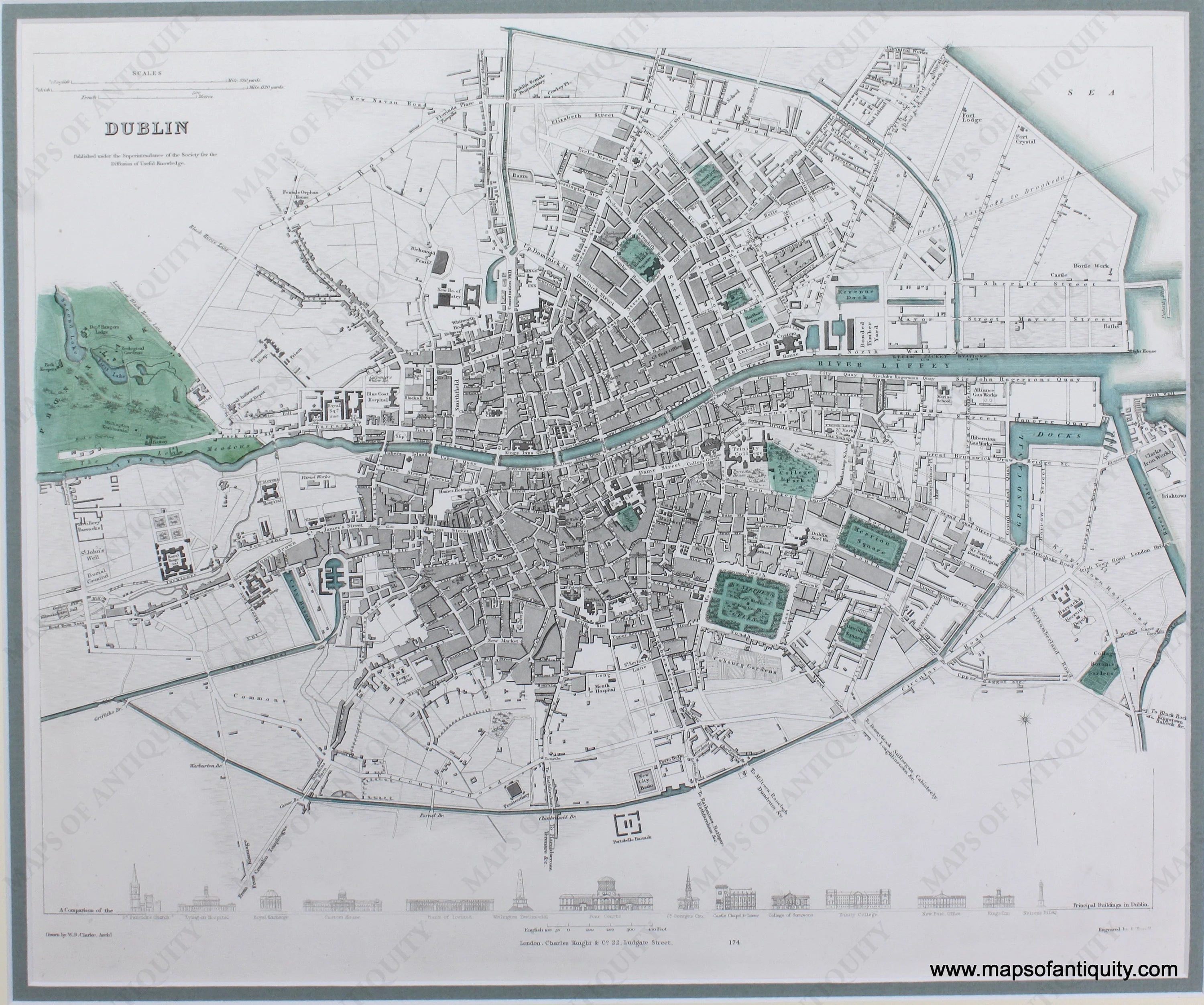 Antique hand-colored map of Dublin, Ireland, published by the Society for the Diffusion of Useful Knowledge (SDUK), c. 1840. Shows streets, parks, notable buildings, the River Liffey, and more. At bottom is a comparison of the principal buildings in Dublin. Matted. Very good antique condition. Measures approx. 11.75 x 15 inches to the neatline.