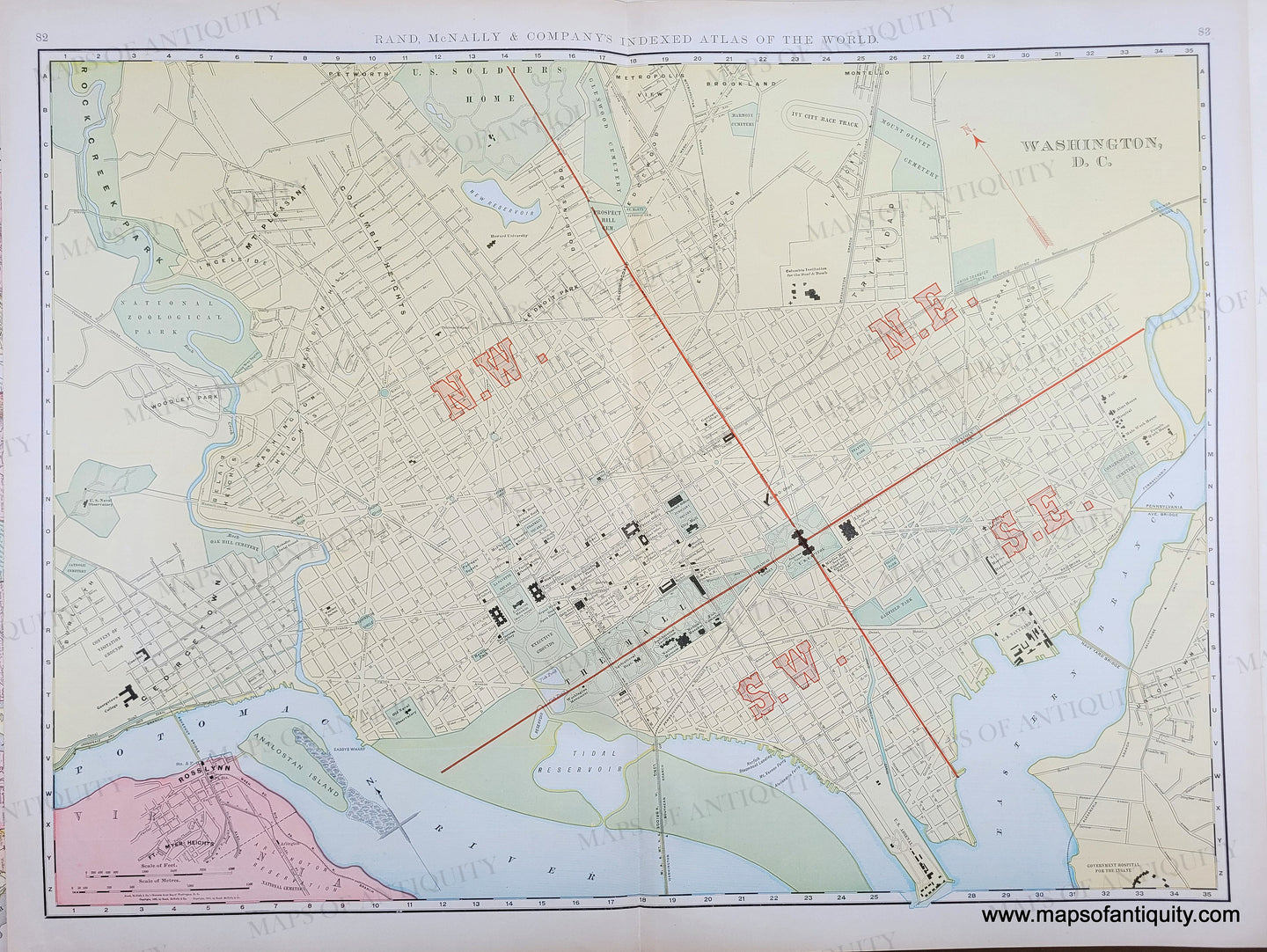 Antique map of Washington DC from Rand McNally's Indexed Atlas of the World, 1902. Original printed color. Shows roads, railroads, parks, notable buildings, etc. Very good antique condition with minor signs of age. Center fold as issued. Measures approx 19 x 25.75 inches to the neatline.