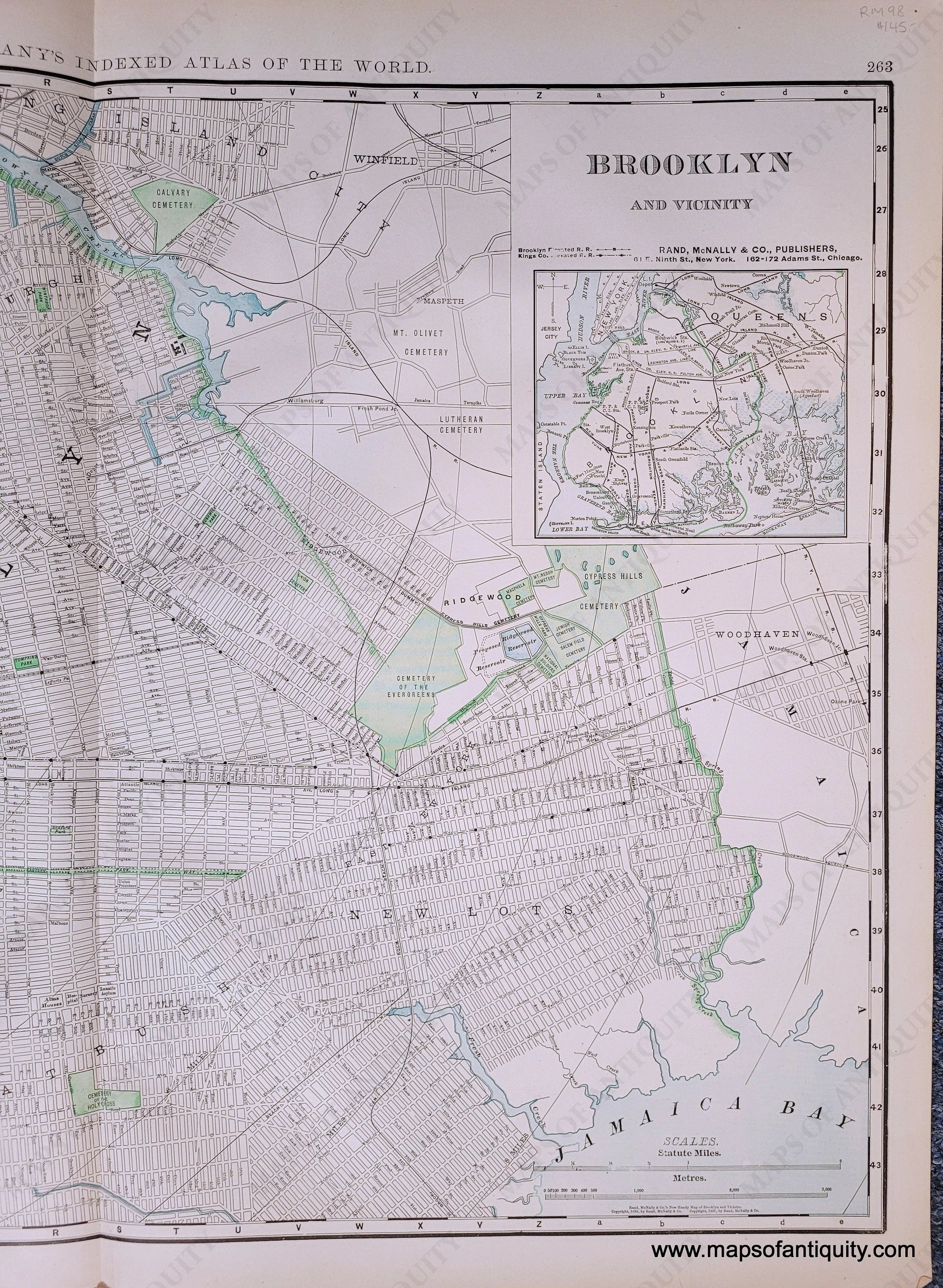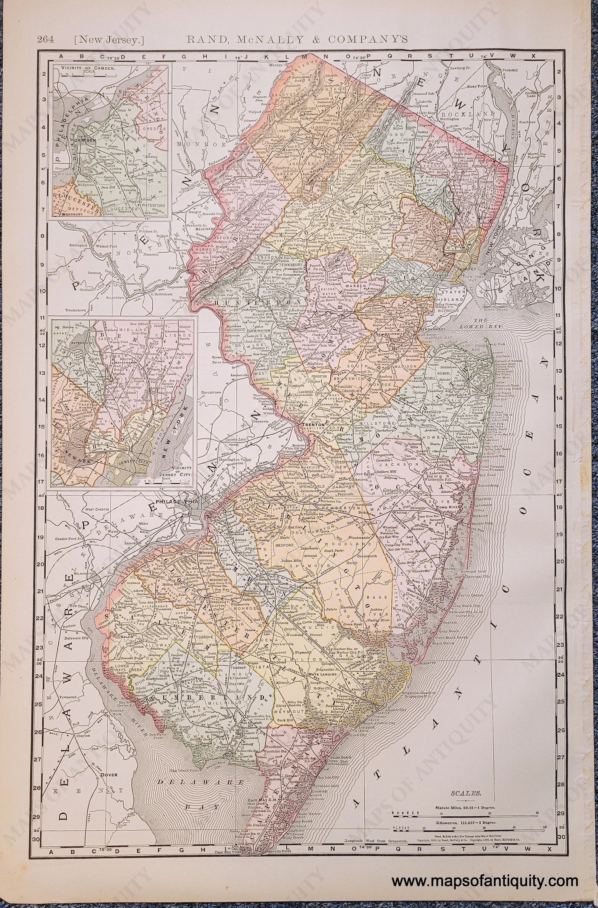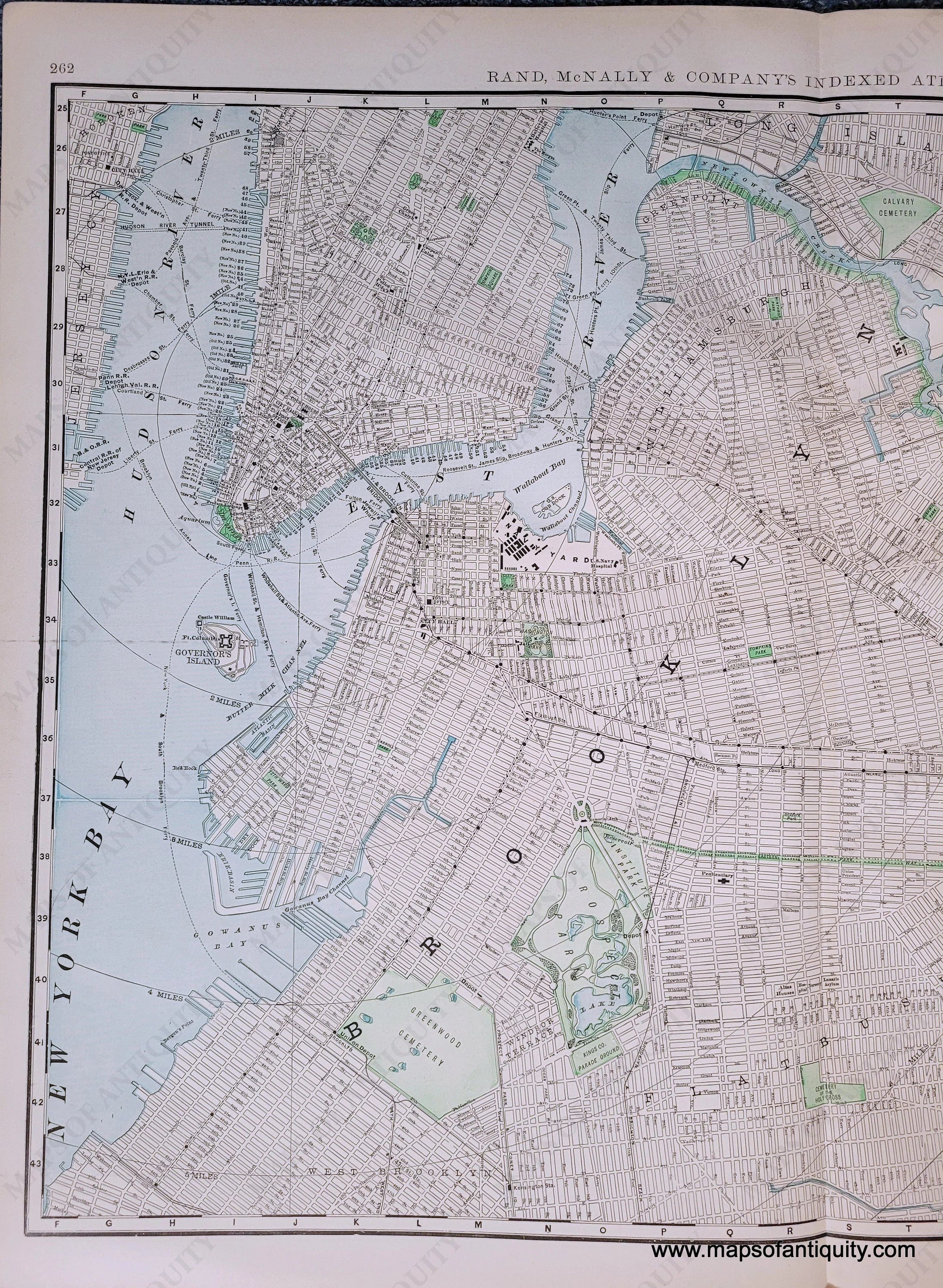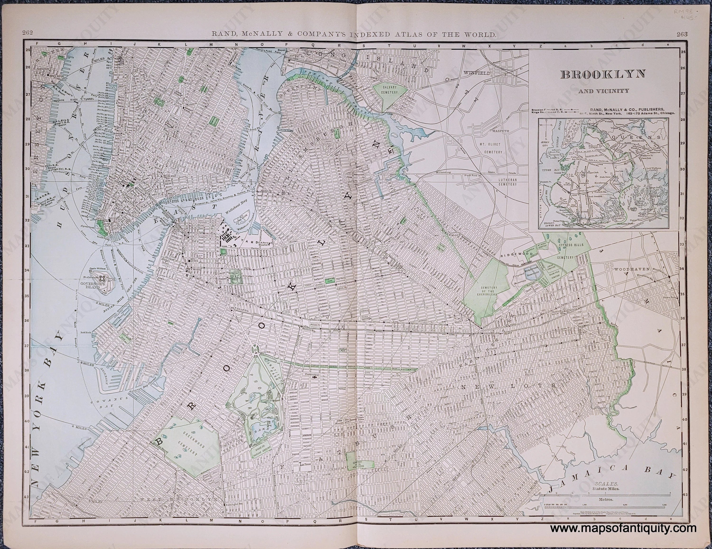 Antique map of Brooklyn, New York NY from Rand McNally's Indexed Atlas of the World, 1898. Original printed color. On back side is a map of New Jersey, colored by county. Very good antique condition with minor signs of age. Center fold as issued. Measures approx 19 x 25.75 inches to the neatline. NJ map is approx. 19.5 x 12.5 inches.