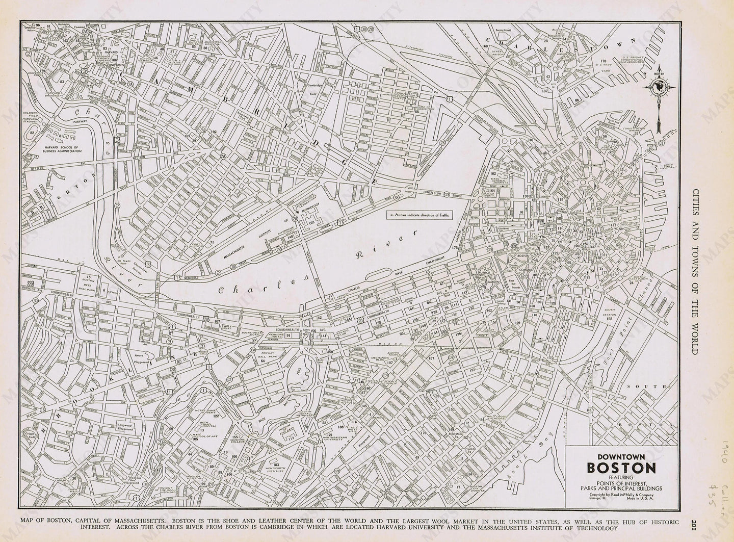 Antique printed black & white map of downtown Boston, published in 1940 by Rand-Mcnally as part of the Colliers World Atlas and Gazeteer. Includes points of interest, principle buildings, and parks. Good condition, approximately 14" x 11" to the paper edges.