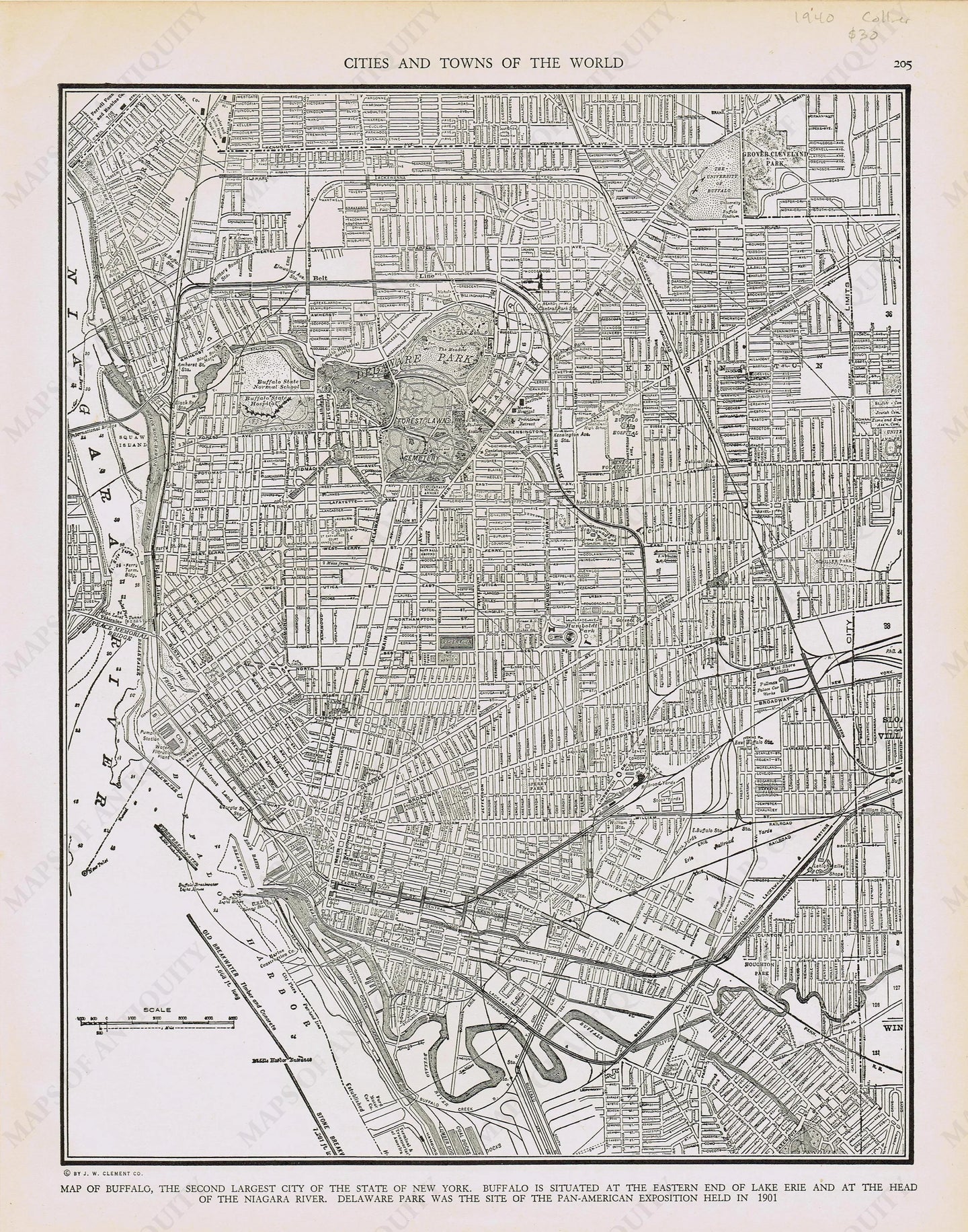 Antique printed black & white map of Buffalo, published in 1940 by Rand-Mcnally as part of the Colliers World Atlas and Gazeteer. Good condition, approximately 14" x 11" to the paper edges.