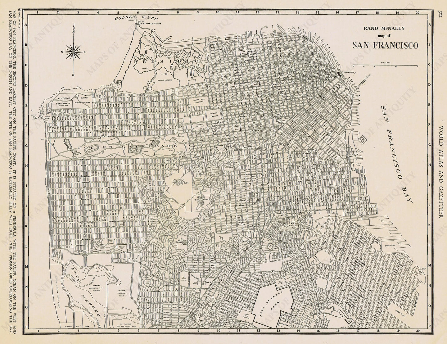 Antique printed black & white map of San Francisco, published in 1940 by Rand-Mcnally as part of the Colliers World Atlas and Gazeteer. Good condition, approximately 11" x 14" to the paper edges.