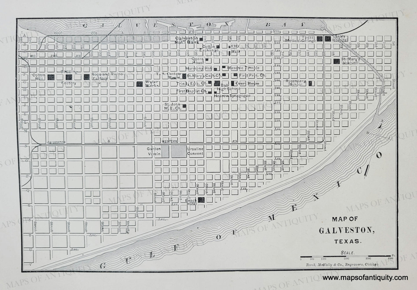 Antique map of Galveston, TX from the Indexed Atlas of the World by Rand McNally & Co. 1892. Shows streets, railroads, notable buildings. Very good antique condition with mild overall toning. Measures approx. 5.75 x 8.5 inches to the neatline.