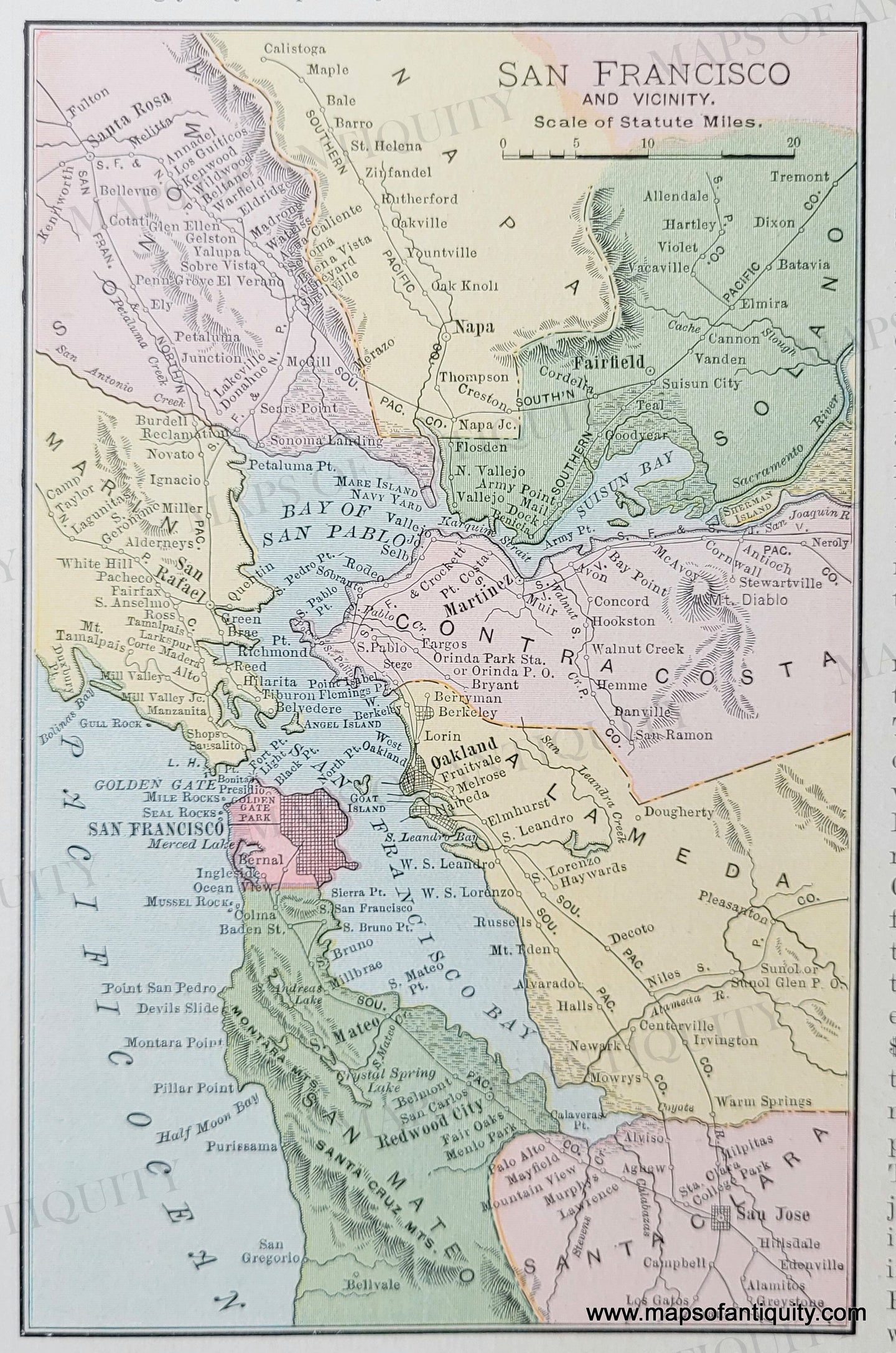 Antique map of San Francisco, CA from the Indexed Atlas of the World by Rand McNally & Co. 1902. Shows streets, railroads and railroad stops, other nearby cities of Oakland and San Jose, some topography. Original printed color. Very good antique condition with mild overall toning. Matted. Measures approx. 6.5 x 4.25 inches to the neatline.