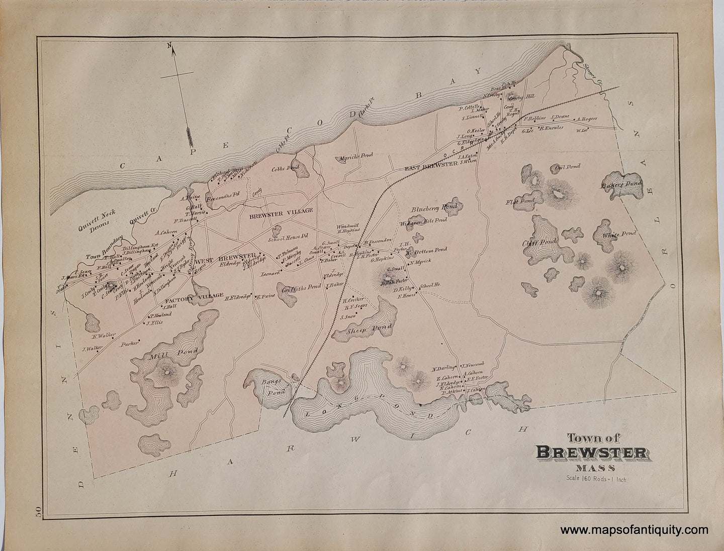 Antique hand-colored map of the Town of Brewster, from the 1880 Walker Atlas of Barnstable County, Massachusetts. Shows landowners' names. Densely populated areas like the village center are enlarged on a separate sheet. Measures approx. 16 x 14 inches. Good to very good overall antique condition with mild toning and some minor foxing/stains.