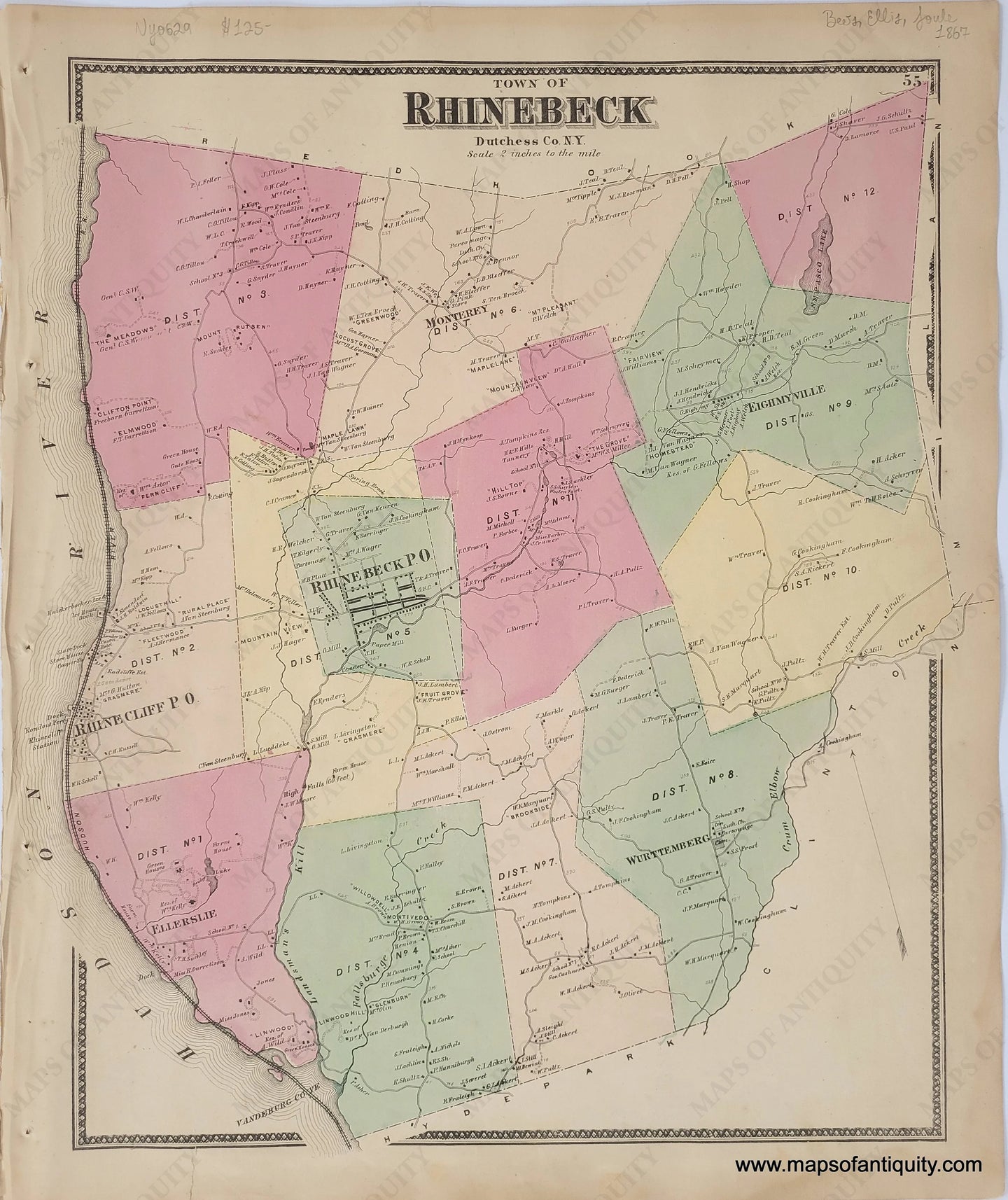 Antique hand-colored map of the town of Rhinebeck (Dutchess County, New York). Shows district boundaries, names of property owners, and some points of interest. Good overall antique condition with heavy toning throughout, some areas of minor foxing, and a tear at the bottom left of the page which has been archivally repaired. By Beers, Ellis, and Soule, in the Atlas of New York and Vicinity, 1867. Measures approximately 15.75" x 12.75" to the neatline. (Note: Map extends past the neatline along the left side, and at single points on the bottom and right side- see picture.)