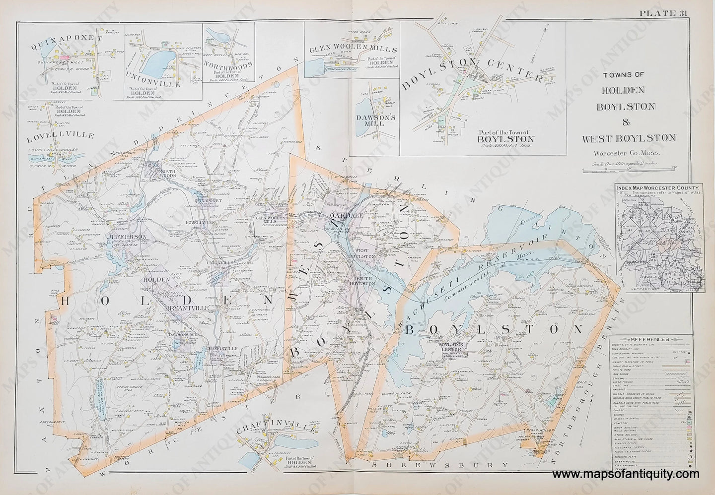 From the New Topographical Atlas of the County of Worcester Massachusetts, by Richards, 1898. Includes property owners' names. Overall good to very good condition, double sheet measures approx. 21 x 31 inches.