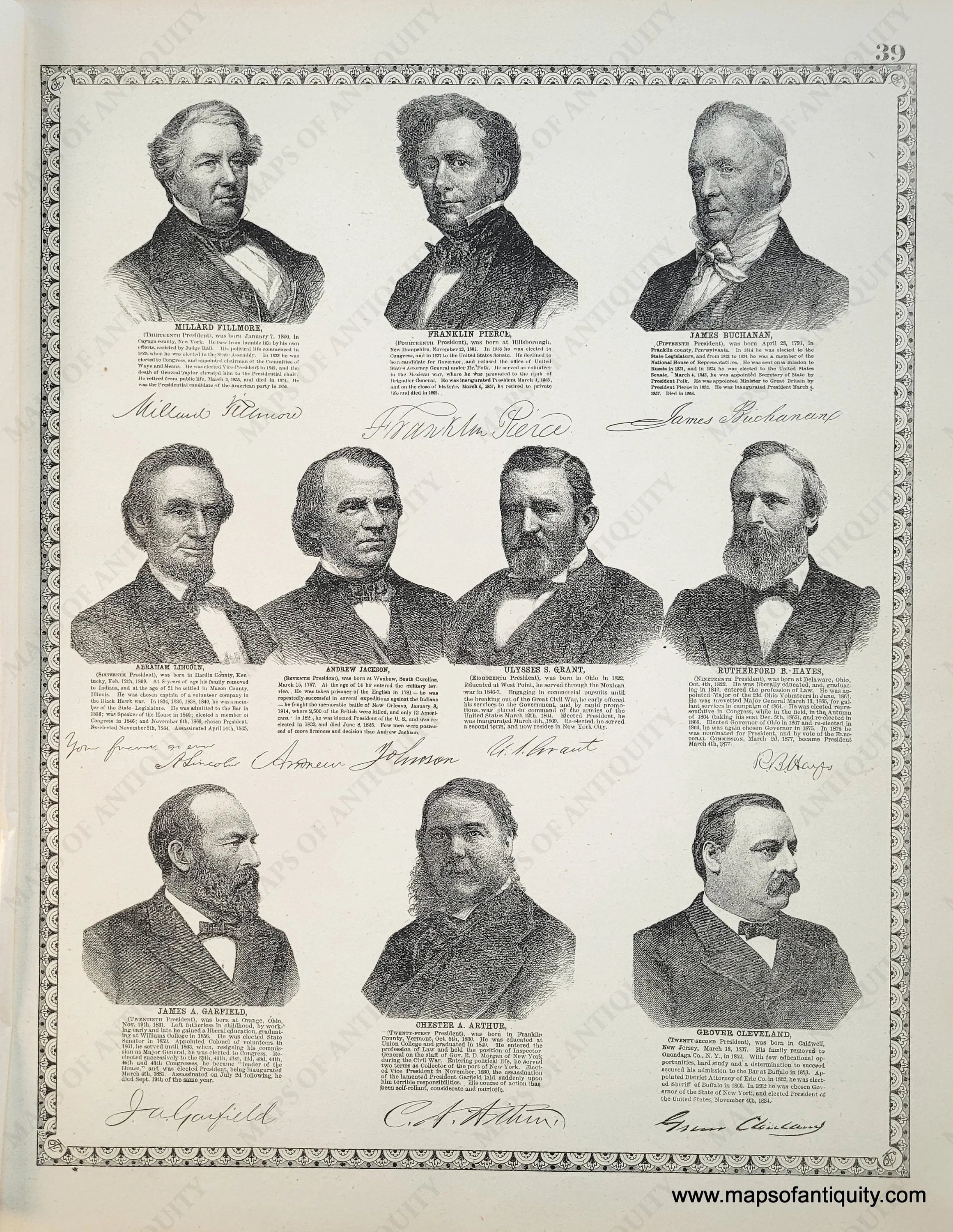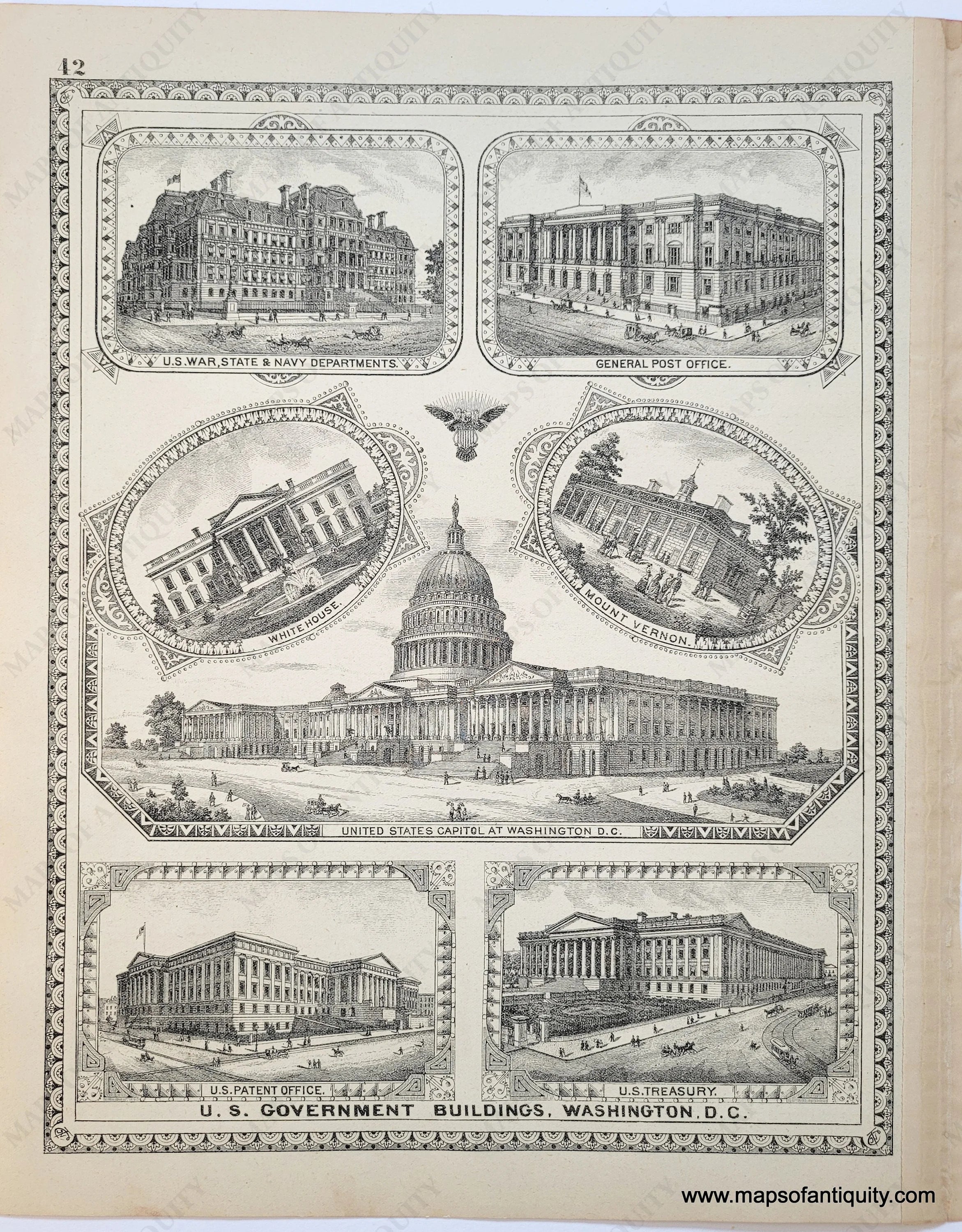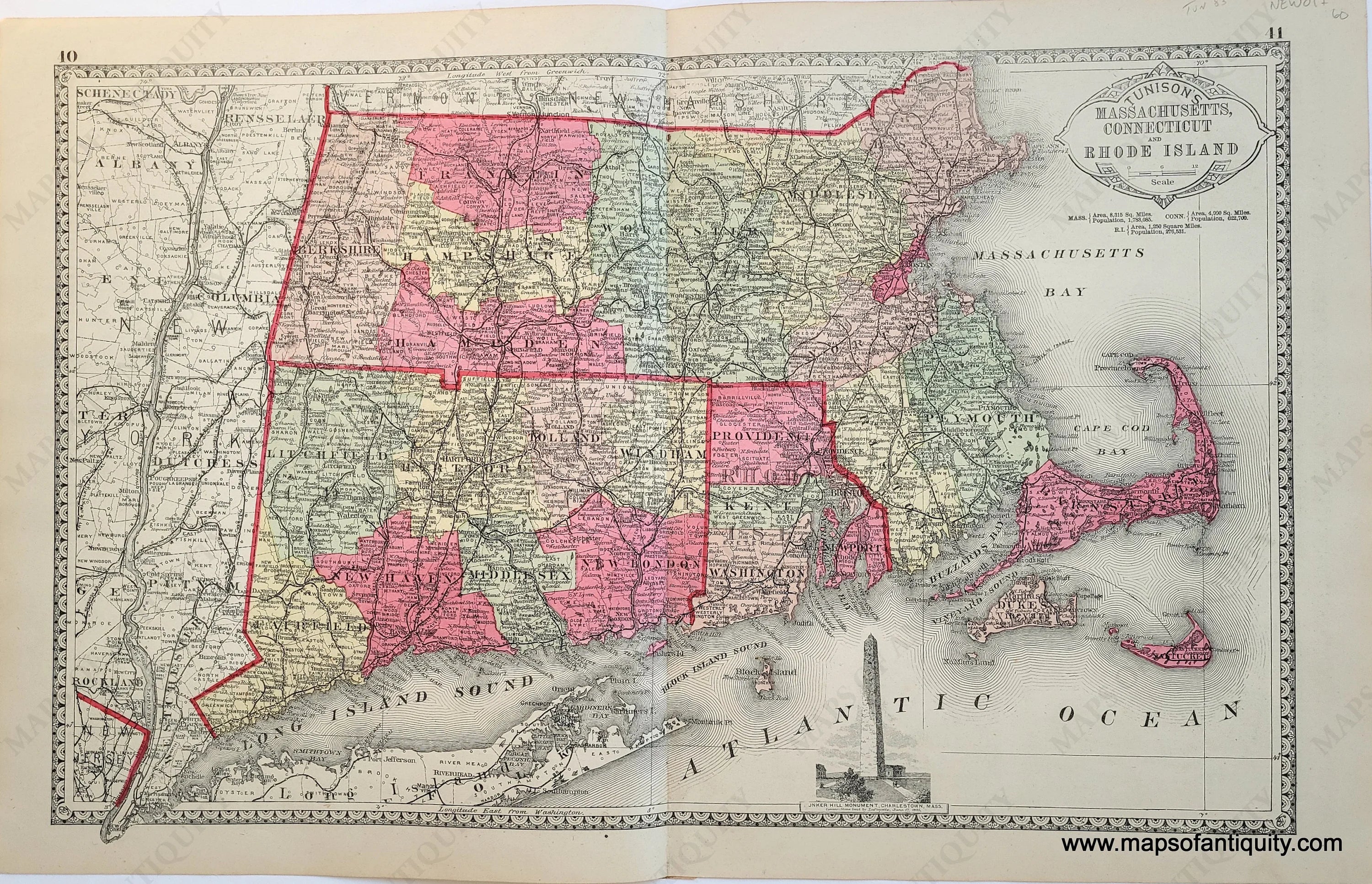 Antique hand-colored map with decorative border, of Massachusetts, Connecticut, and Rhode Island, with counties delineated by color, and showing towns, townships, water bodies, and major routes. On the back of the map are prints showing presidents and US Government Buildings in Washington DC. Good overall antique condition, with minor signs of age. Measures approx. 12.5 x 20 inches.