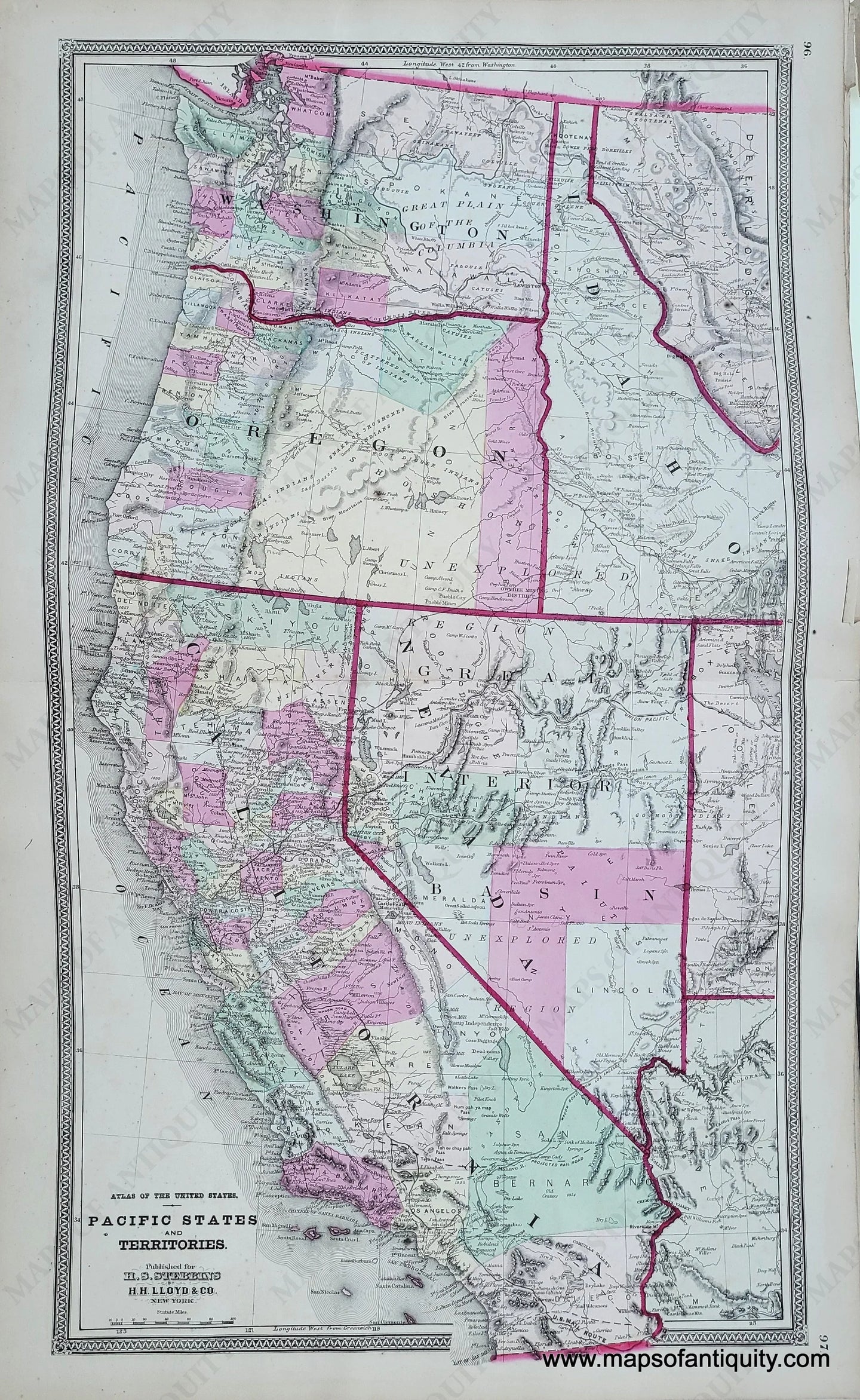 Antique map from the Atlas of the State of Ohio From Surveys under the Direction of H.F. Walling; to which is added an Atlas of the United States, published for Henry S. Stebbins by H.H. Lloyd & Co., 1868. Colored by county, showing railroads, proposed railroads, towns, cities, and more. Includes Washington, Oregon, California, and Nevada. This map has some information about the Native American Indians in the region. The Union Pacific Railroad was in progress and was incomplete- it was done through California but in progress in Nevada. Notes in Nevada suggest it was largely unexplored. This was a time of expansion and change in this part of the country. Good antique condition with tears at the paper edges (archivally repaired), some paper loss, some toning, small spots, and some wear at the paper edges. Mild water stain at paper edge. Paper is fragile and should be handled carefully. Measures approx. 14 x 26 inches to the outside of the decorative border. Price is reflective of condition.