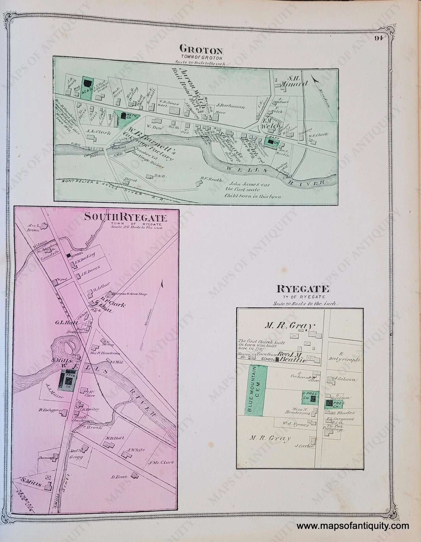 Antique map from the Atlas of Caledonia County, Vermont, published 1875 by Beers, Ellis & Soule. Caledonia is part of the area known as the Northeast Kingdom. Showing railroads, rivers, ponds, etc. This map shows houses and other buildings with the property owners' names. Good overall antique condition, with some spots and stains. Measures approximately 14 x 11 inches.