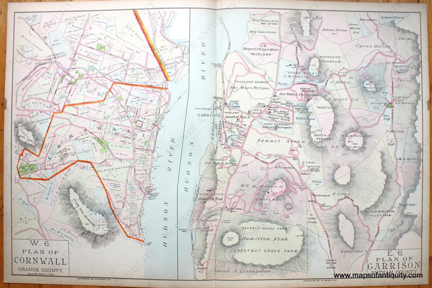 Antique sheet with two hand colored maps from the "Atlas of the Hudson River Valley from New York City to Troy Including a Section of about 8 Miles in Width" published in 1891 by Watson & Co. under the supervision of F.W. Beers. Shows property owners, parks, major land and water features, etc. In very good antique condition with toning, slight wear at the paper edges. Backed with linen, with center fold as issued. Measures approximately 29 x 19.5 inches to the neatline.