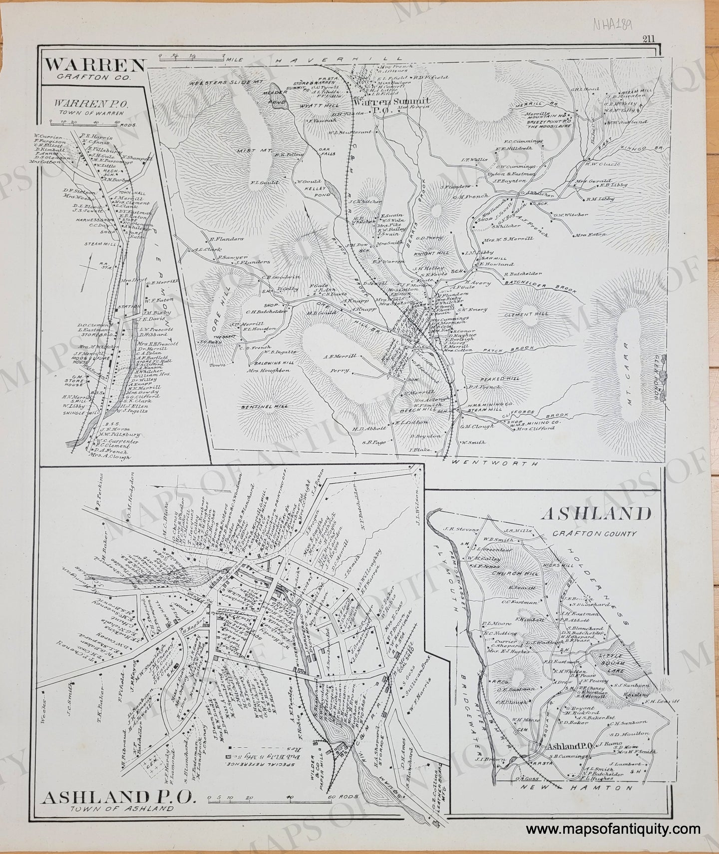 Antique black and white maps of Warren, New Hampshire and Ashland, New Hampshire, with inset maps of the vicinities of the Warren Post Office and the Ashland Post Office. From the Town and City Atlas of the State of New Hampshire, by D.H. Hurd, 1892. Includes the names of property owners at the time of publication. Very good antique condition with a couple spots of very minor foxing/soiling. Measures approx. 13 x 17.25 inches.