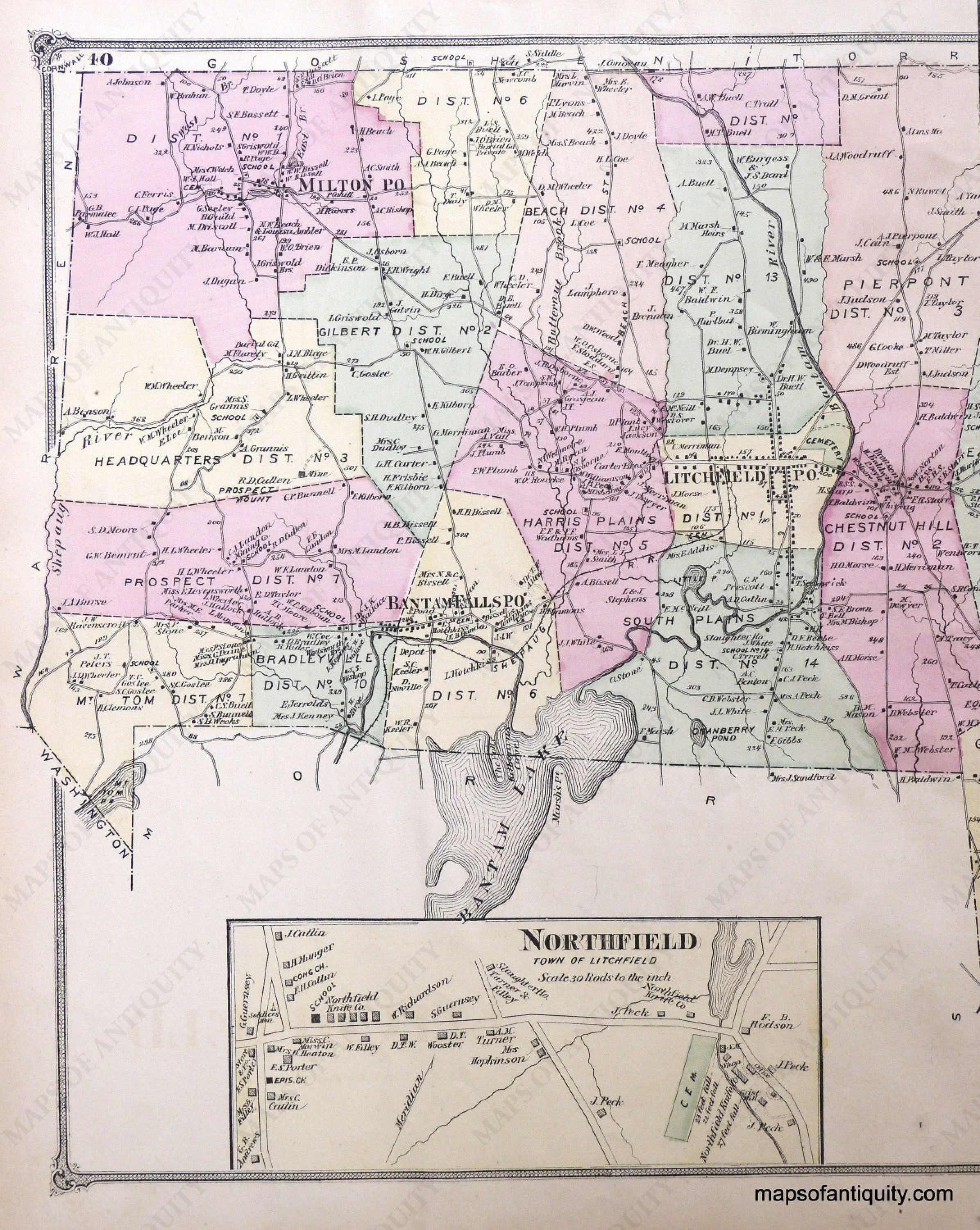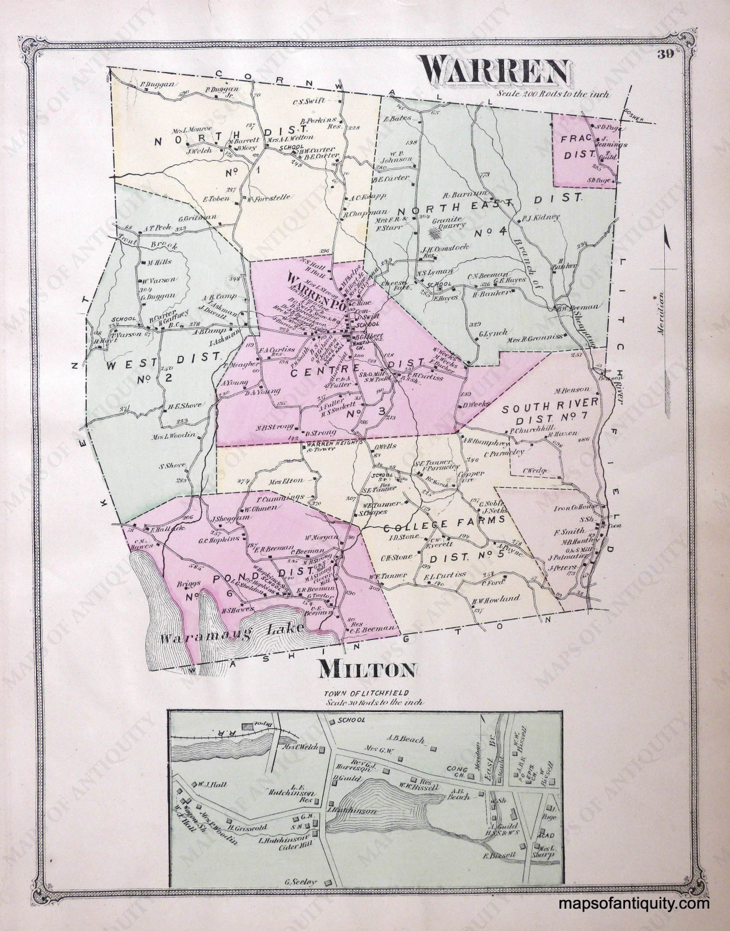 Antique hand colored map of the Town of Warren, Connecticut, from F.W. Beers' County Atlas of Litchfield, 1874, with villages and districts of the time delineated by color, and when the Village of Warren was an active hub of the town; showing major roads, railroads, property owners, schools, churches, cemeteries, businesses and a small corner of Lake Waramaug; includes separate map of the Village of Milton in the Town of Litchfield; verso displays western half of Litchfield town map and a village map of Northfield in the Town of Litchfield. Very good antique condition with overall toning, measures approx. 13.5 x 11 inches.