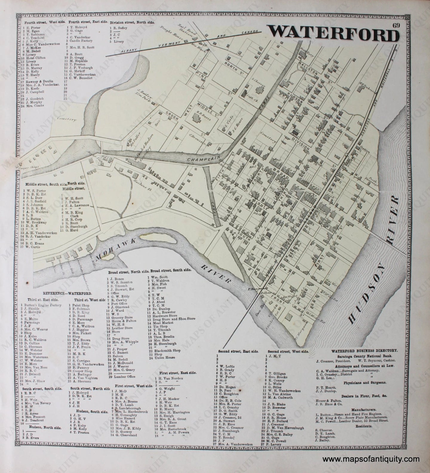 This antique, hand colored, engraved map of the center of Waterford, from the New Topographical Atlas of Saratoga County New York, was published by Stone and Stewart in 1866. All property owners of the day are listed with business listings as well. Railroads, post offices, streets, rivers, and land features are detailed. Measures approximately 14 x 12 inches, and is in very good antique condition, with light minor spotting.
