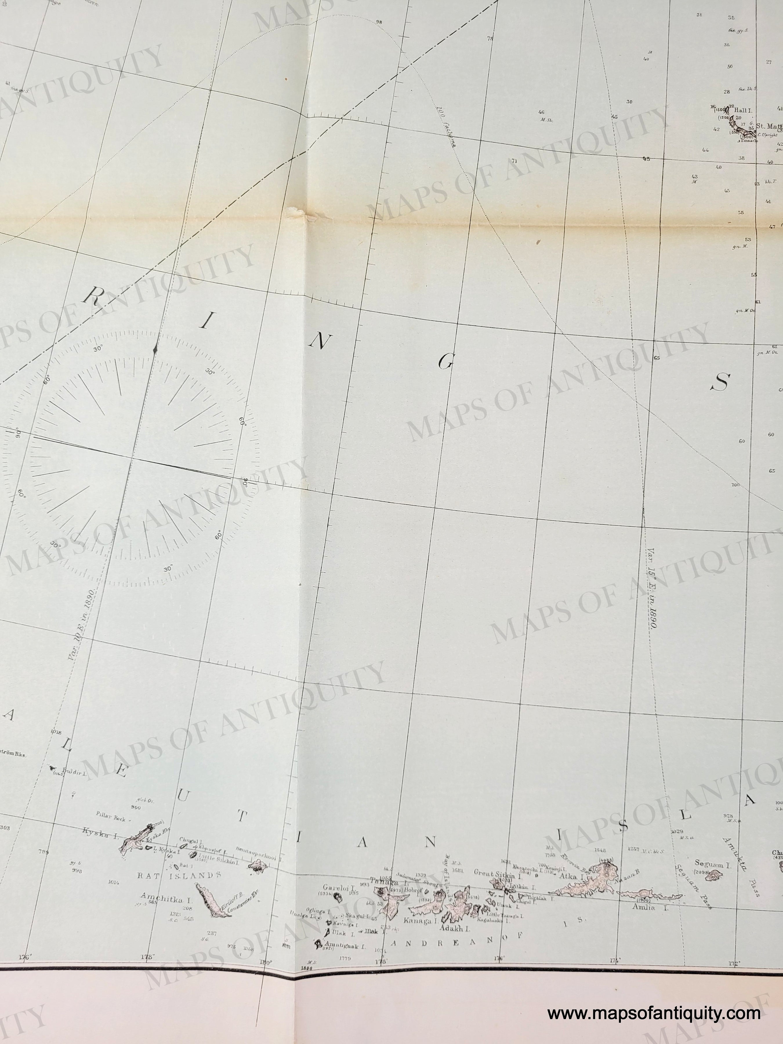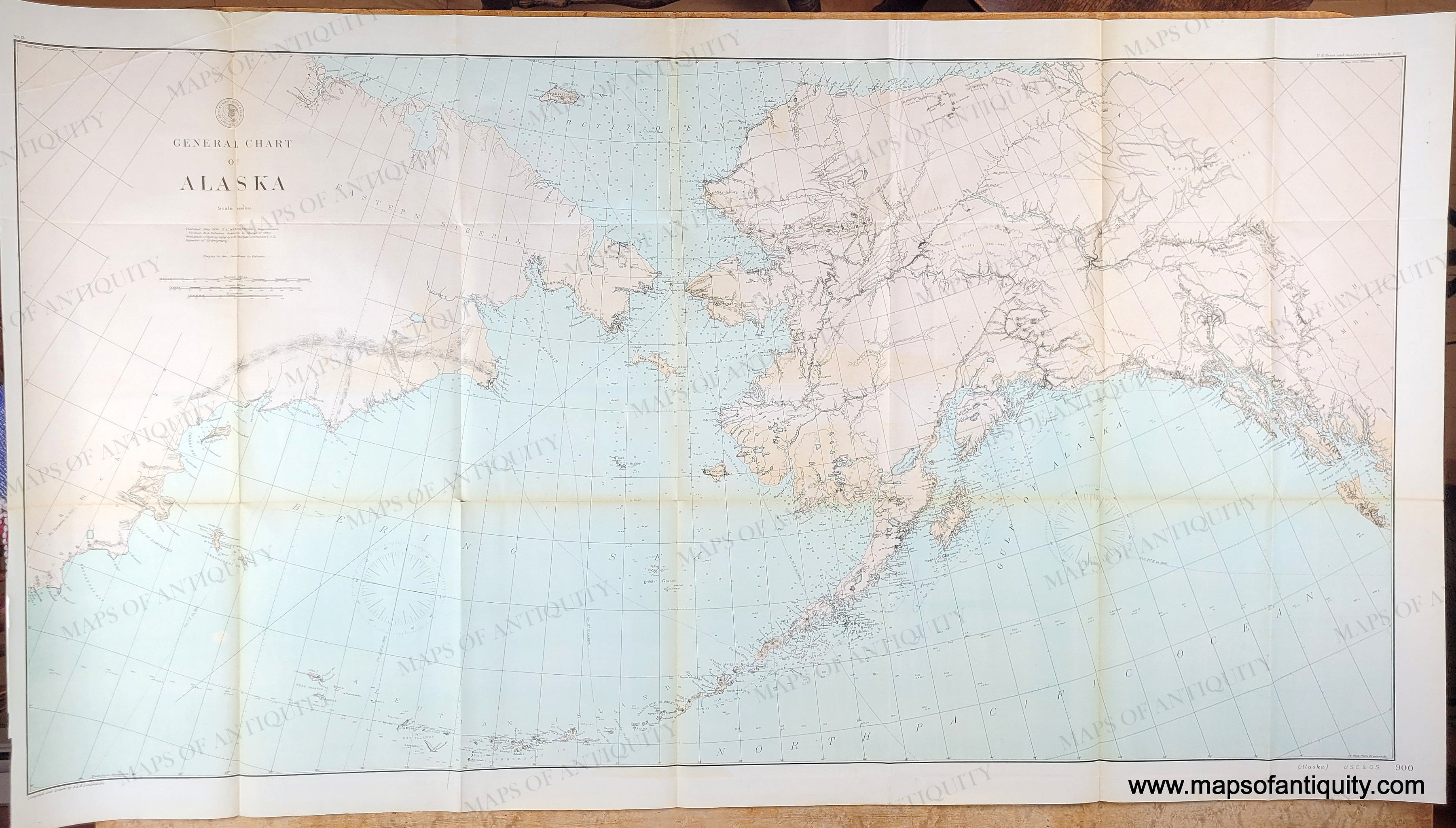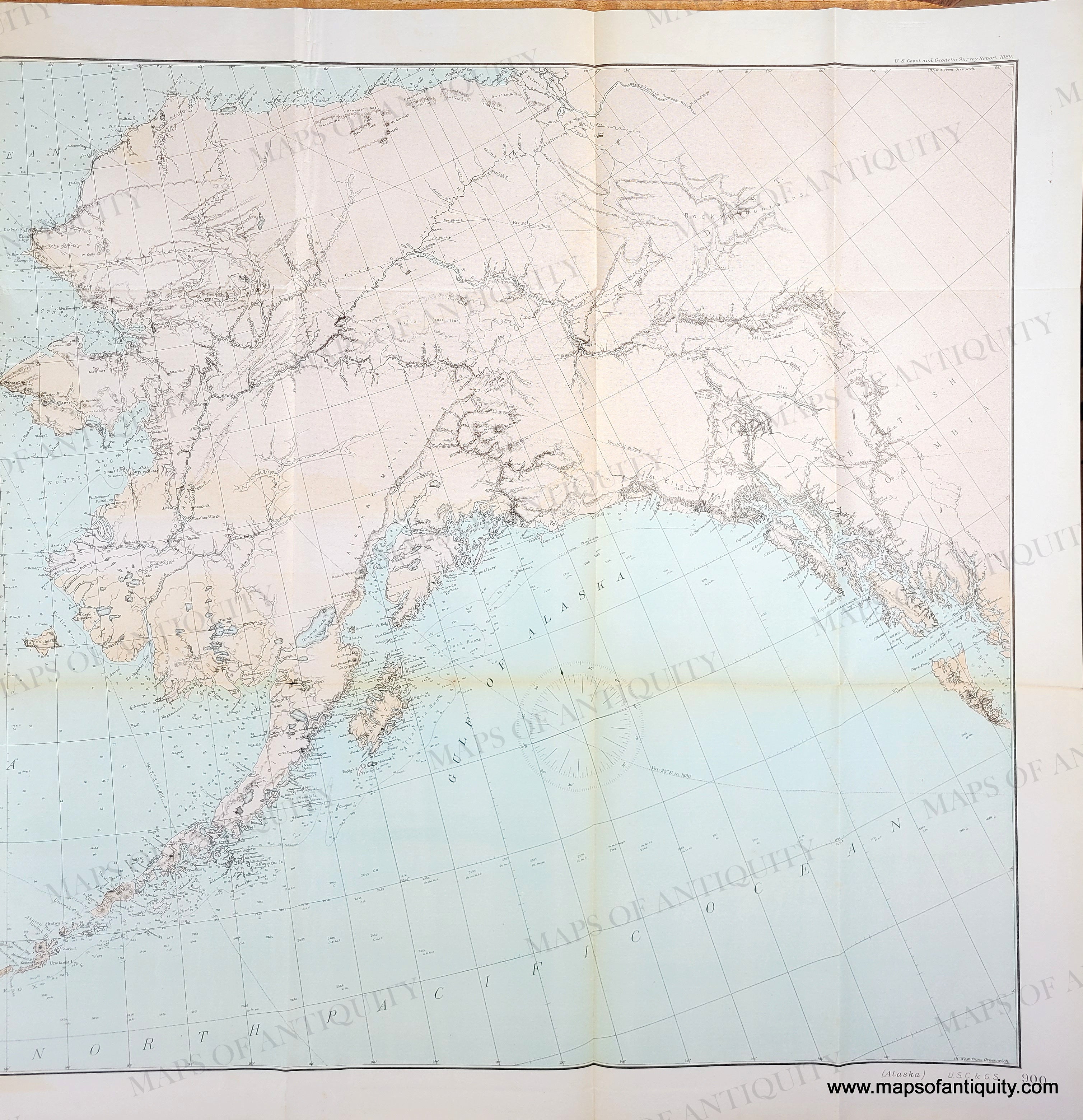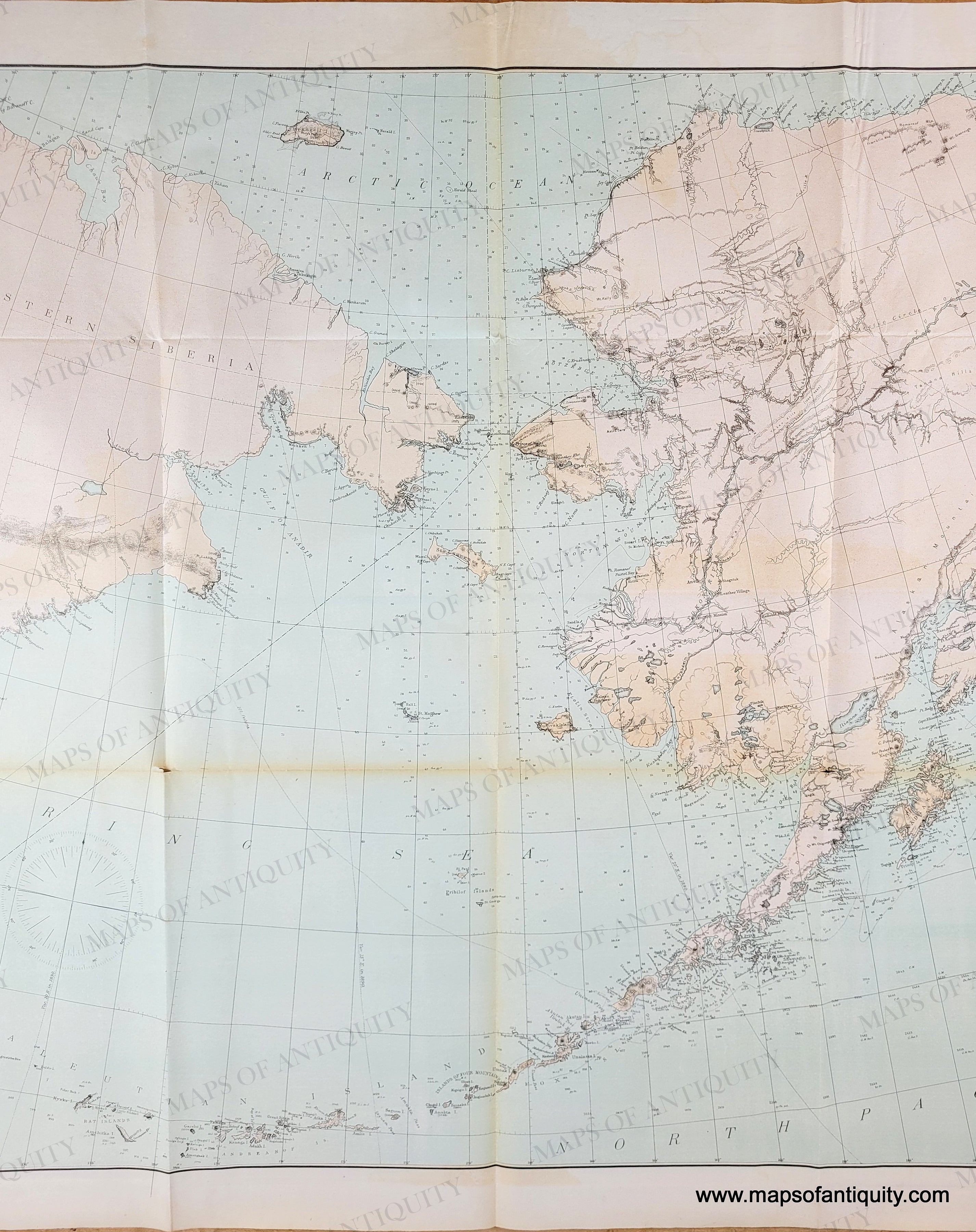 Antique map with original printed color in light pink-tan for the land and light blue for the water showing Alaska and part of Asia. Genuine-Antique-Map-General-Chart-of-Alaska-1890-USC-GS-Maps-Of-Antiquity