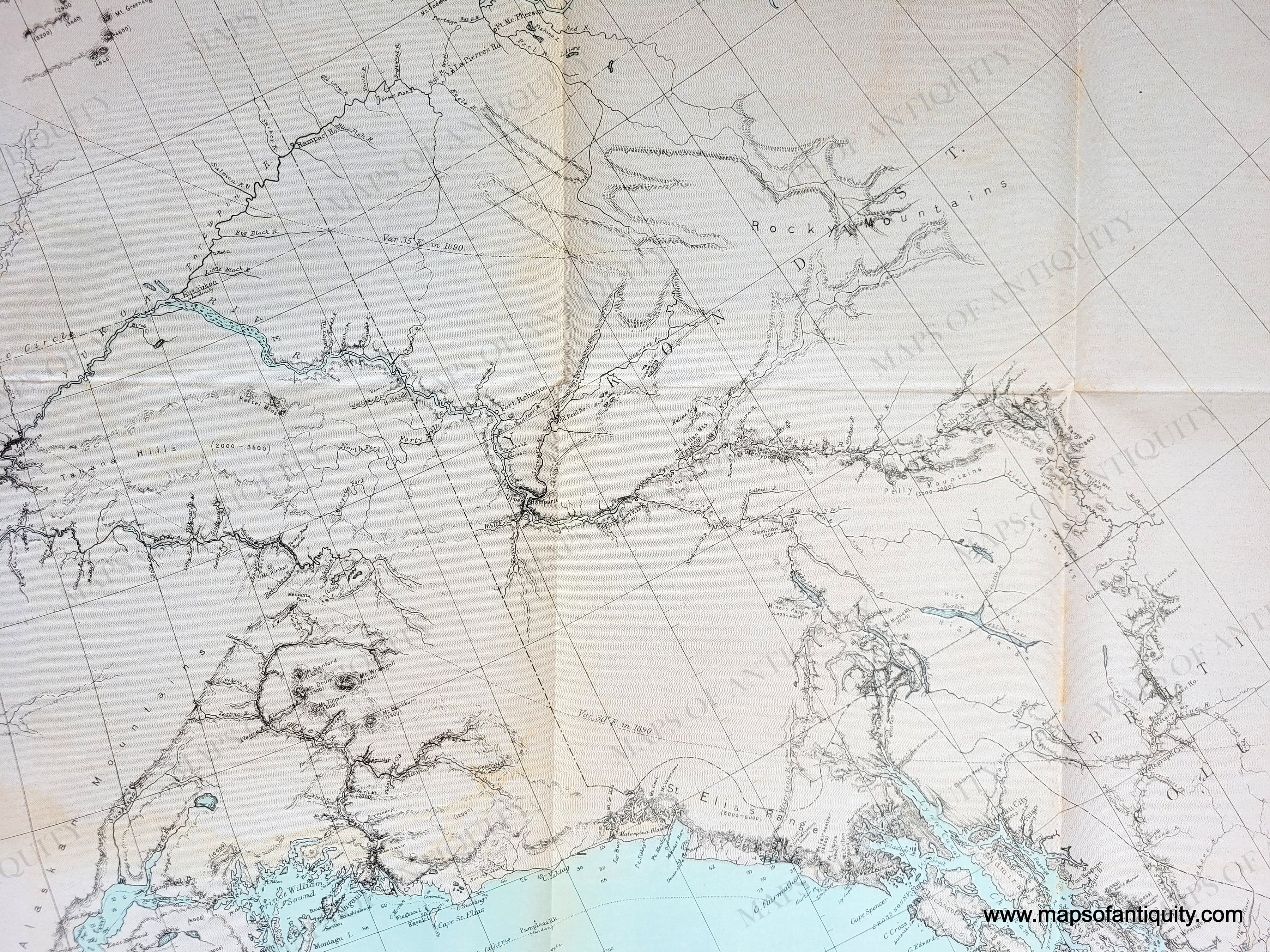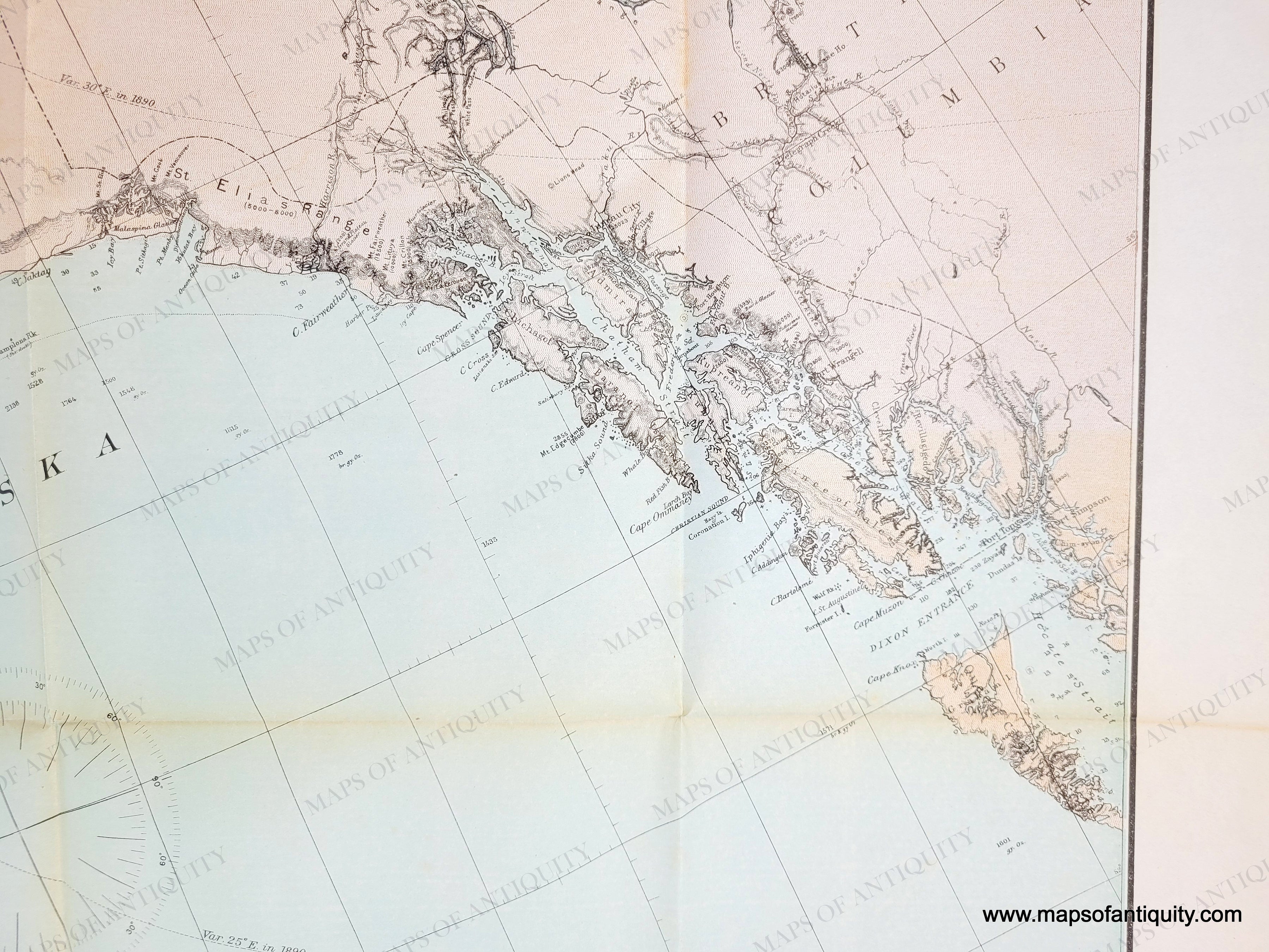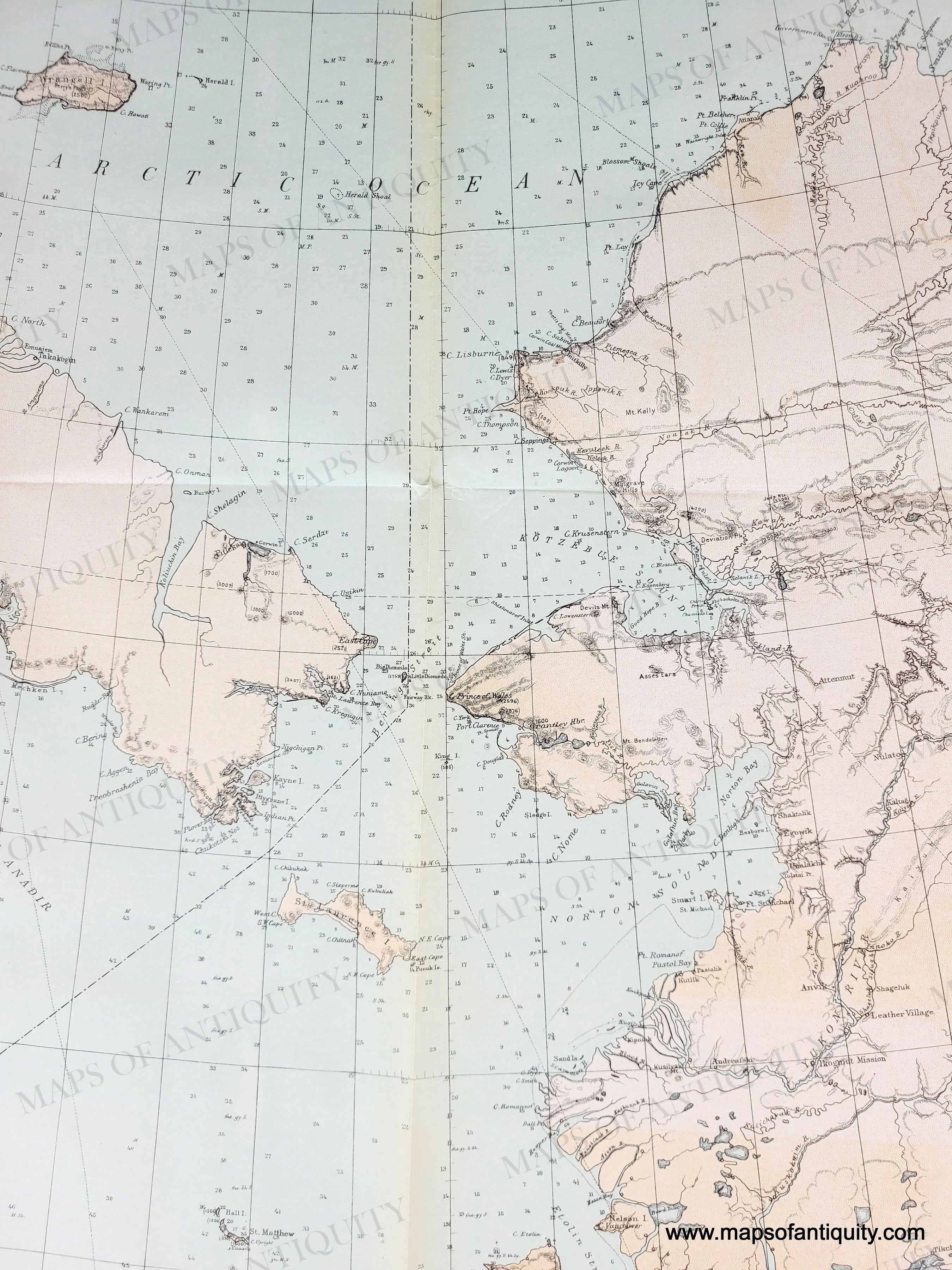 Antique map of Alaska with the coast of Siberian Russia, by the US Coast and Geodetic Survey, 1890. Original printed-color. Includes detailed topographic information, navigational information such as soundings, and towns and forts. Very good antique condition with folds as issued, a few minor spots, and some tiny separations at the fold intersections. Approx. 25.75 x 48.5 inches to the neatline.