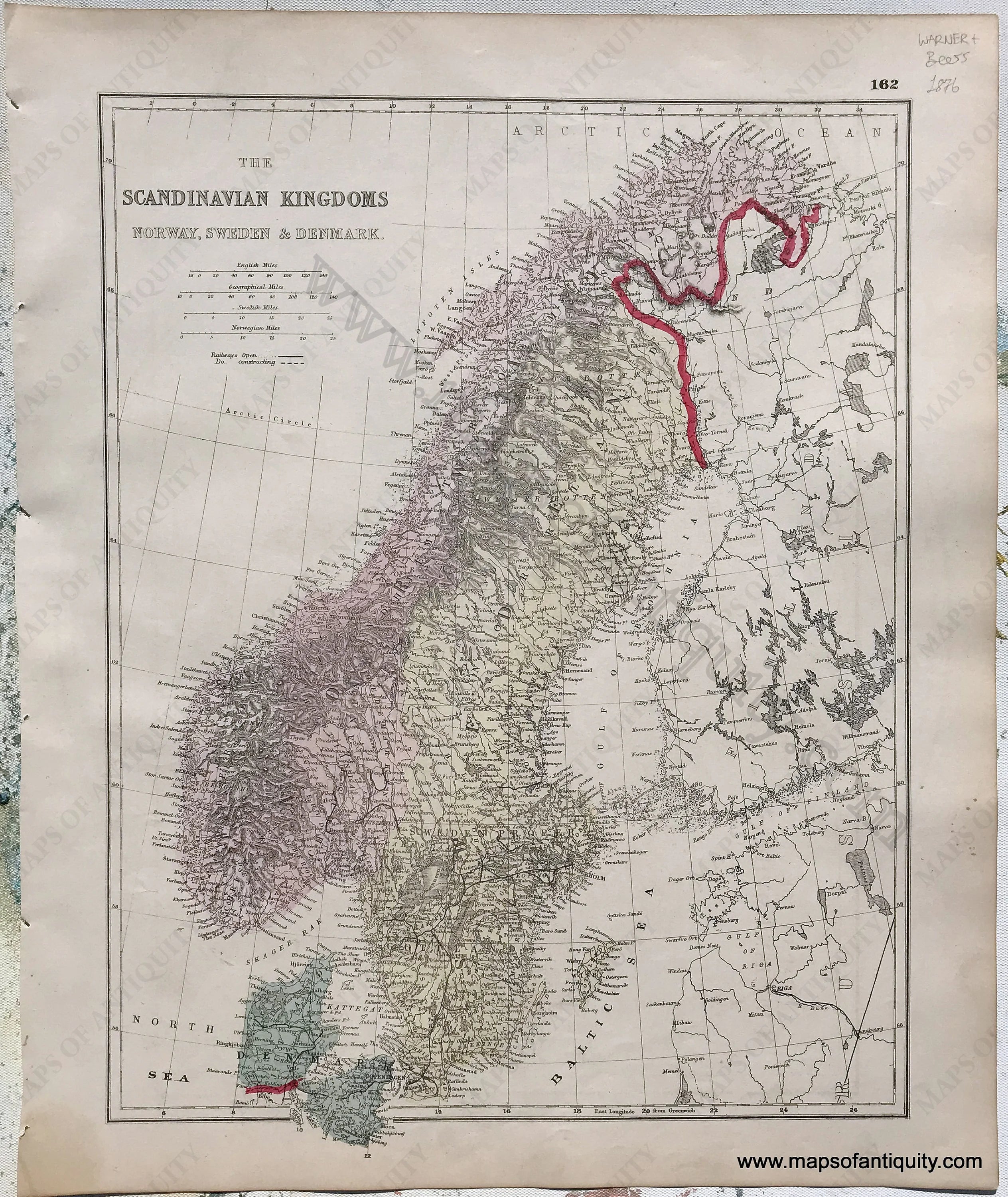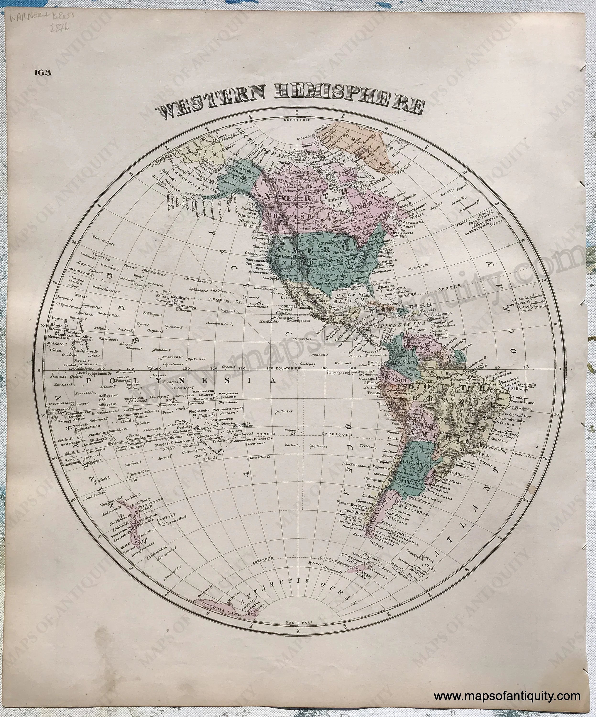 Antique double-sided map: on one side is a map of the Western Hemisphere of the world, on the other side is a map of Scandinavia. Published in the Atlas of the State of Illinois, published by Warner & Beers with the Union Atlas Co., 1876. Good to very good condition, with some minor spots and overall mild toning. Page measures approx. 17.5 x 14.5 inches.